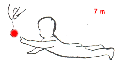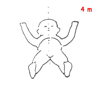 | "Simetría en espejo" en el plano sagital. Manos en línea media. | Eleva cabeza del plano de examen. Logra el control cefálico definitivo. |