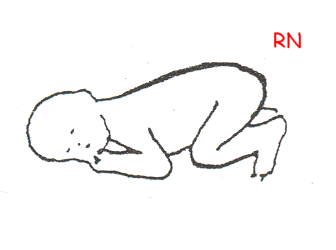 | Prono: Esboza movimiento rítmico reflejo de la cadera y rodillas. Inmovilidad de la cintura escapular. | CRAWLING: Miembros superiores adelante. Tronco y tórax plano. |
