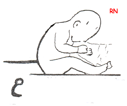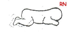 | Cabeza lateralizada. Pelvis elevada. Rodillas flexas. | Cabeza erguida. Apoyo antebrazos. Pelvis plana. Participación del R.E. laberíntico sobre la cabeza. |