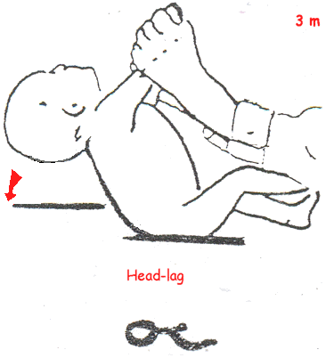 | Prueba "tironeado sentado" muestra "cabeza colgante". Hipotonía axial. | Sigue plano de los hombros. | Fase activa. |